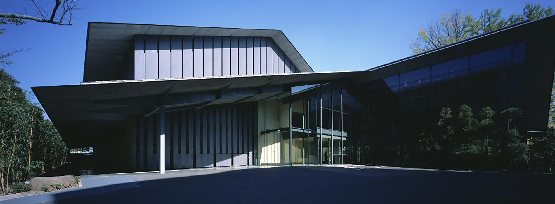 隈研吾在展覽空間透過環繞的大片玻璃帷幕,希望打造出一座帶有屋頂、與庭園融為一體,並與周遭環境和諧共生的美術館。入口旁的竹林廊道將城市的喧囂隔離在外,讓建築、庭園與藝術之間能夠在幽靜中展開一場深邃的對話。